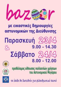Με μεγάλη επιτυχία ολοκληρώθηκε και φέτος το πασχαλινό bazaar. Ευχαριστούμε θερμά τους φίλους και συναδέλφους Καλλιαρη Δέσποινα, Παπαποστόλου Χρυσούλα, Βήκα Ελένη, Ζηνδρου Ζωή, Κωτσάκη Μαρίνα, Στάθη Ειρήνη, Παπαγιαννοπούλου Αναστασία, Γκίκα Μαρία, Κουρουση Ιωάννη, Τοψακη Σωτήριο και Μαμαλουδη Αλεξάνδρα που προσέφεραν τις δημιουργίες τους και όσους μας τίμησαν με την παρουσία τους. Τα έσοδα προσφέρθηκαν για τις ανάγκες του Ξενώνα Φιλοξενίας Γυναικών θυμάτων βίας του Δήμου Βόλου.