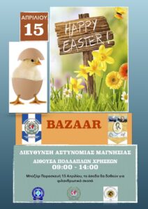 Με την αναμενόμενη επιτυχία διοργανώθηκε και φέτος το πασχαλινό bazaar της Τοπικής Διοίκησης Μαγνησίας της Διεθνούς Ένωσης Αστυνομικών και της Ένωσης Αστυνομικών Υπαλλήλων Μαγνησίας. Ευχαριστούμε θερμά τους συναδέλφους Κάλλιαρη Δέσποινα, Παπαποστόλου Χρυσούλα, Βήκα Ελένη, Ζήνδρου Ζωή, Κωτσάκη Μαρίνα, Στάθη Ειρήνη, Κουρούση Ιωάννη, Γιαννάκου Χριστίνα, Σκόνδρα Γεώργιο, Μπαντιδάκη Ηρώ, Κουφοζήση Αγγελική και Γκίνη Μιχαήλ που προσέφεραν τις δημιουργίες τους και όσους μας τίμησαν με την παρουσία τους. Τα έσοδα θα προσφερθούν για τις ανάγκες της Ελληνικής Εταιρία Νόσου Alzheimer και Συγγενών Διαταραχών Βόλου.