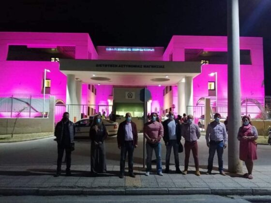 Με αφορμή την παγκόσμια ημέρα κατά του καρκίνου του μαστού και με στόχο την ευαισθητοποίηση των γυναικών πάνω στο θέμα, η Τοπική Διοίκηση Μαγνησίας της Διεθνούς Ένωσης Αστυνομικών σε συνεργασία με την Ένωση Αστυνομικών Υπαλλήλων Μαγνησίας φωταγώγησαν συμβολικά, στις αποχρώσεις του ροζ, το κτίριο της Διεύθυνσης Αστυνομίας. Ευχαριστούμε που μας τίμησαν με την παρουσία τους, την πρόεδρο ΙΩΑΝΝΟΥ Σοφία και τα μέλη του Συλλόγου Καρκινοπαθών Νομού Μαγνησίας, την πρόεδρο ΑΠΟΣΤΟΛΑΚΗ Εβελιν, τον αντιπρόεδρο ΡΟΥΣΟΓΙΑΝΝΗ Σωτήριο, τη γραμματέα ΠΑΠΑΔΗΜΗΤΡΙΟΥ Άννα Μαρία και όλα τα μέλη του διοικητικού συμβουλίου του Παραρτήματος Βόλου της Ελληνικής Αντικαρκινικής Εταιρείας ,το Διευθυντή της Διεύθυνσης Αστυνομίας Μαγνησίας Αστυνομικό Διευθυντή ΑΛΕΞΑΚΗ Μιλτιάδη, το Διευθυντή της Υποδιεύθυνσης Ασφαλείας Βόλου Αστυνομικό Υποδιευθυντή ΚΑΡΒΕΛΗ Διαμαντή, το Διοικητή του Τμήματος Τροχαίας Βόλου Αστυνομικό Υποδιευθυντή ΚΟΥΛΟΥΡΗ Αθανάσιο και την Αναπληρωτή Διοικητή του Αστυνομικού Τμήματος Βόλου Αστυνόμο Α’ ΕΜΜΑΝΟΥΗΛΙΔΟΥ Ευφροσύνη, τον ταμία του Εθνικού Τμήματος και πρόεδρο της Τοπικής Διοίκησης Λάρισας της Διεθνούς Ένωσης Αστυνομικών ΚΑΛΑΜΠΟΥΚΑ Αχιλλέα και τον Α’ Αντιπρόεδρο της Τοπικής Διοίκησης Λάρισας ΖΑΧΟ Σωτήριο. Το φως της Διεύθυνσης Αστυνομίας Μαγνησίας ευχόμαστε να φωτίσει με υγεία και αγάπη τις ψυχές των συνανθρώπων μας αλλά και να δώσει δύναμη στις γυναίκες όλου του κόσμου.